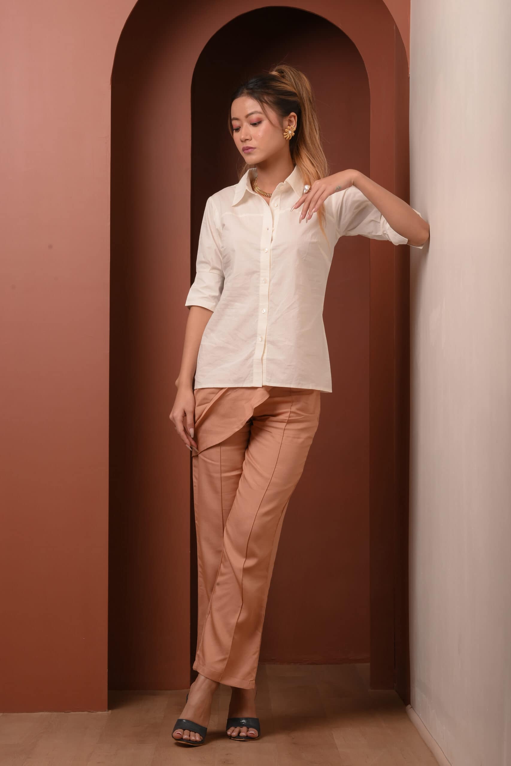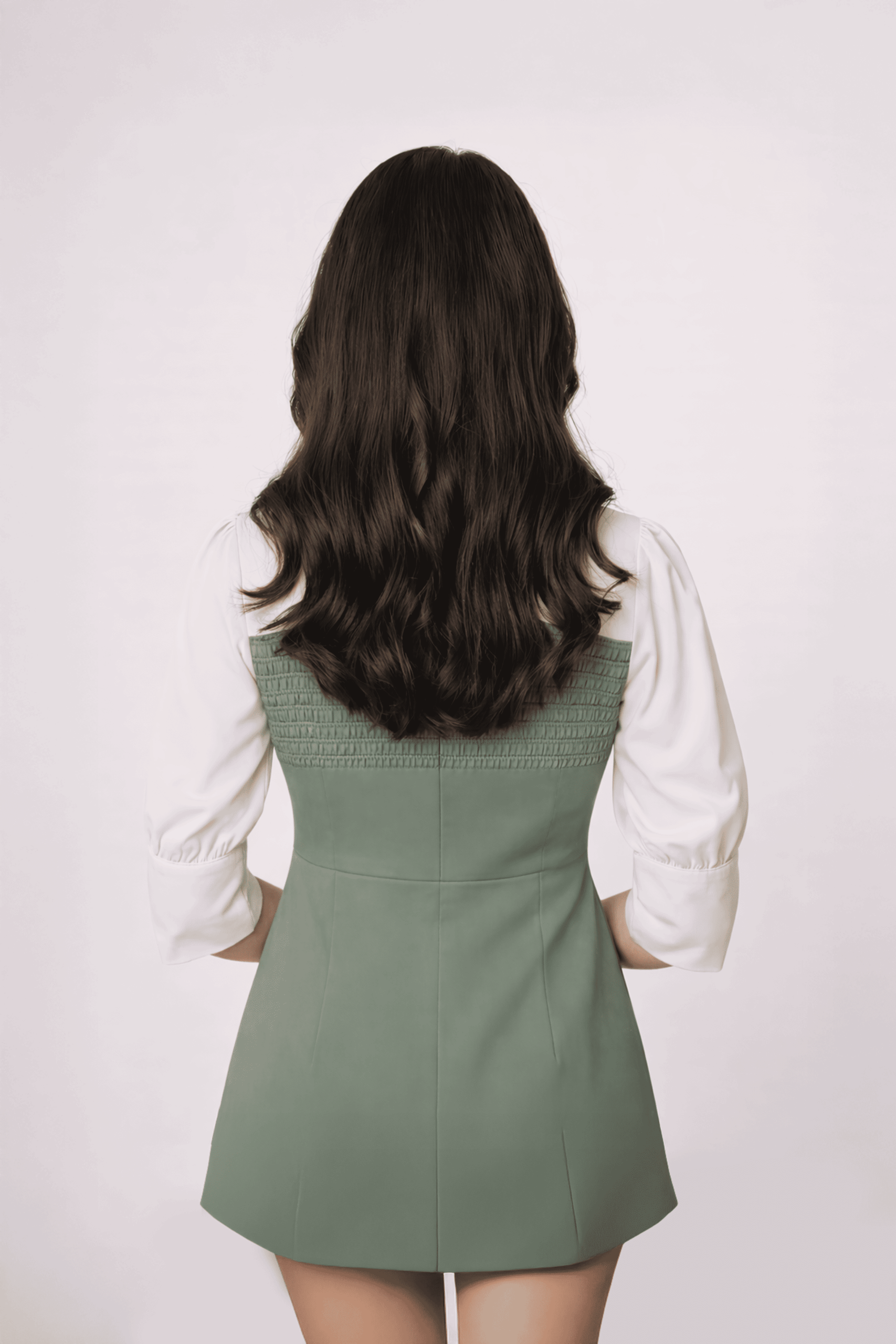 The wrap is shaped with a clean, structured form and features a smocked back for comfort and adaptability, fastening at the side with natural wooden buttons. The inner shirt includes its own button closure, keeping the look minimal yet functional. Worn together, the layers create a refined, sculpted appearance; worn apart, they offer endless styling possibilities.