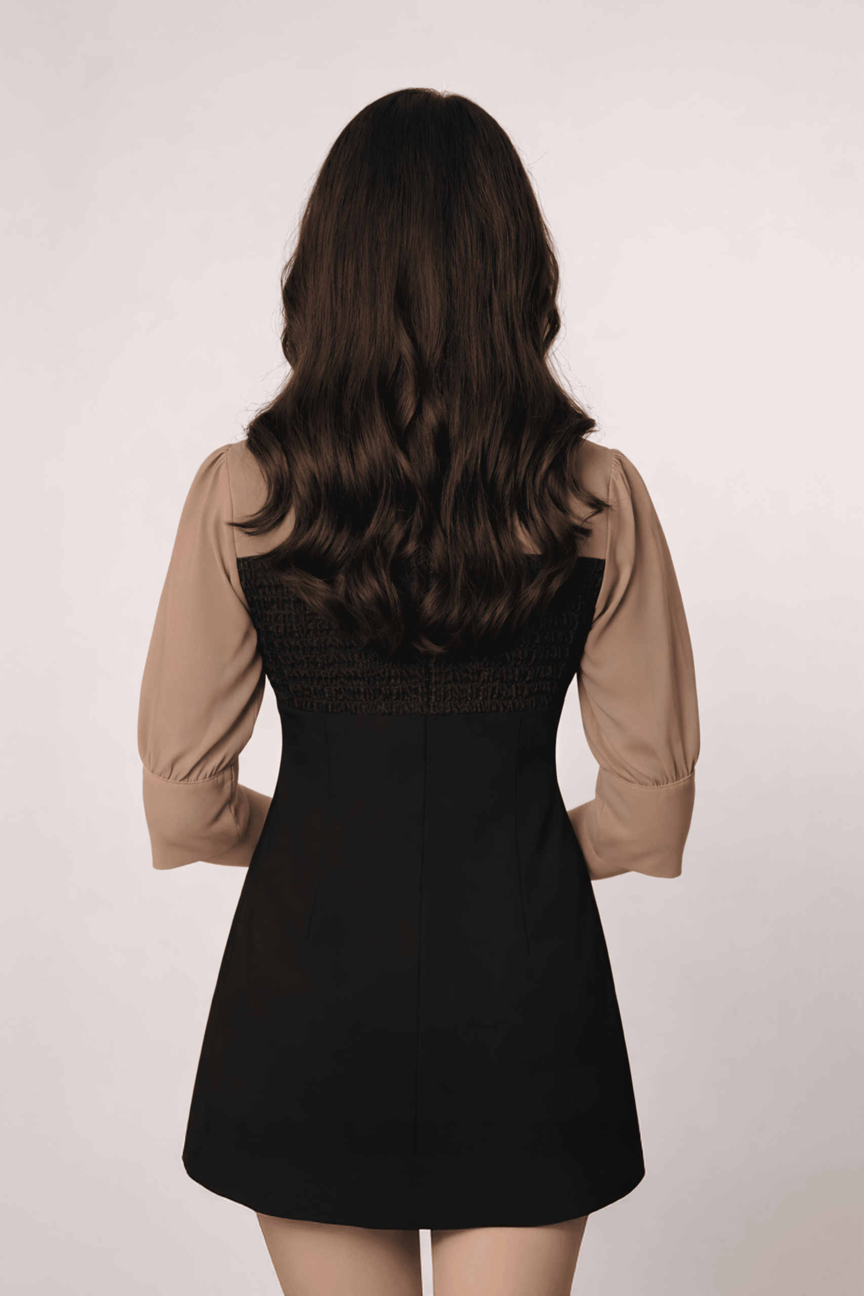 The extended sleeves add a thoughtful balance, offering coverage while maintaining a sleek, modern line. Completed with a refined slit for movement, this dress transitions seamlessly from daytime outings to cocktail moments.