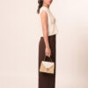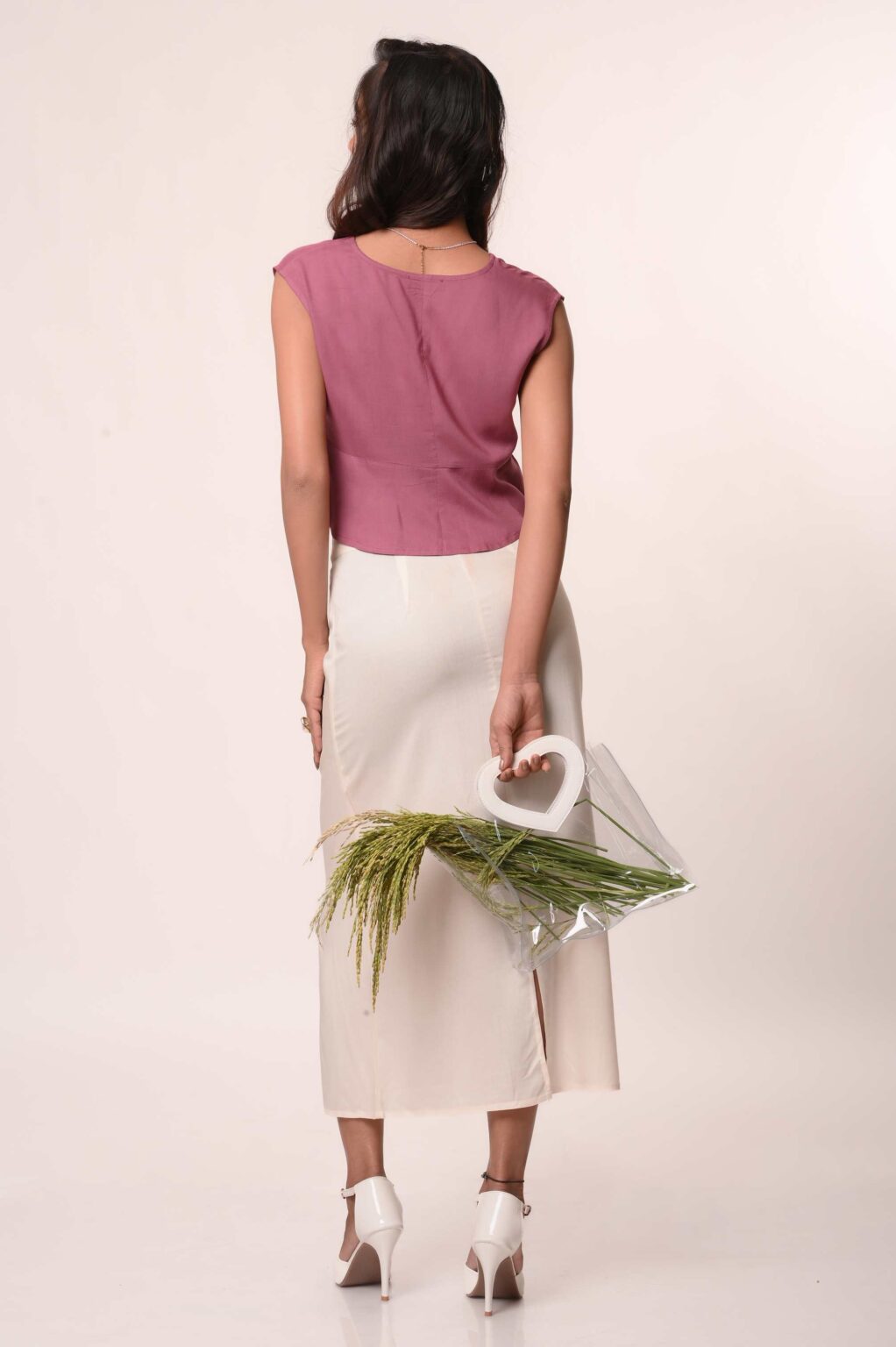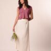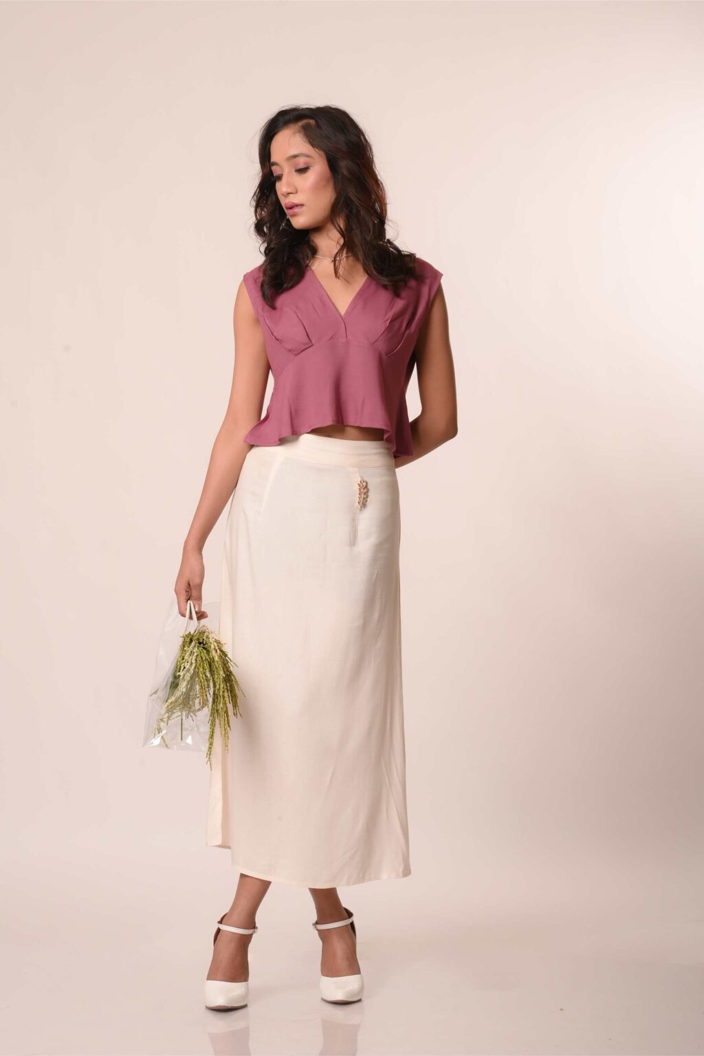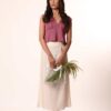 The skirt balances the look with a clean, minimal midi silhouette, finished with a signature metal grain-shaped pin at the side. Worn together, the set feels polished yet effortless suited for relaxed daytime wear and elevated evening moments.