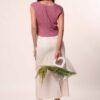 Crafted in fluid viscose, this coordinated set blends clean structure with sculptural detailing. The top features extended shoulders and a soft, high neckline, finished with a metal buckle at the side seam that anchors a wrap-style belt panel—adding a refined, layered look without complicating the fit.