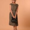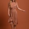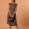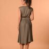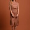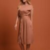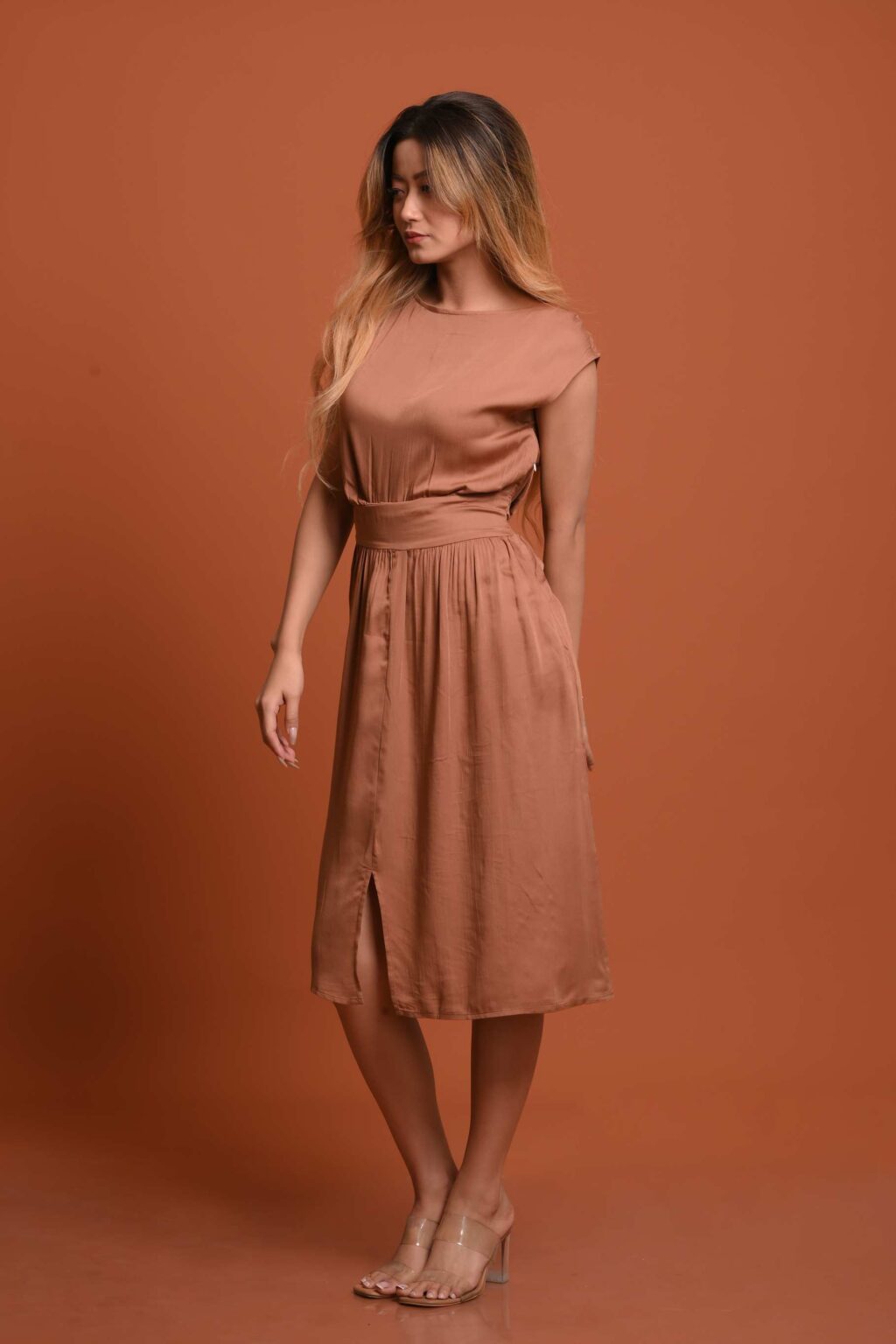 Softly structured and effortlessly feminine, this viscose satin midi dress is designed with a wide, shaped waistband that defines the waist without feeling tight. Gentle gathers fall from the waist, creating natural movement and an easy, elegant drape.