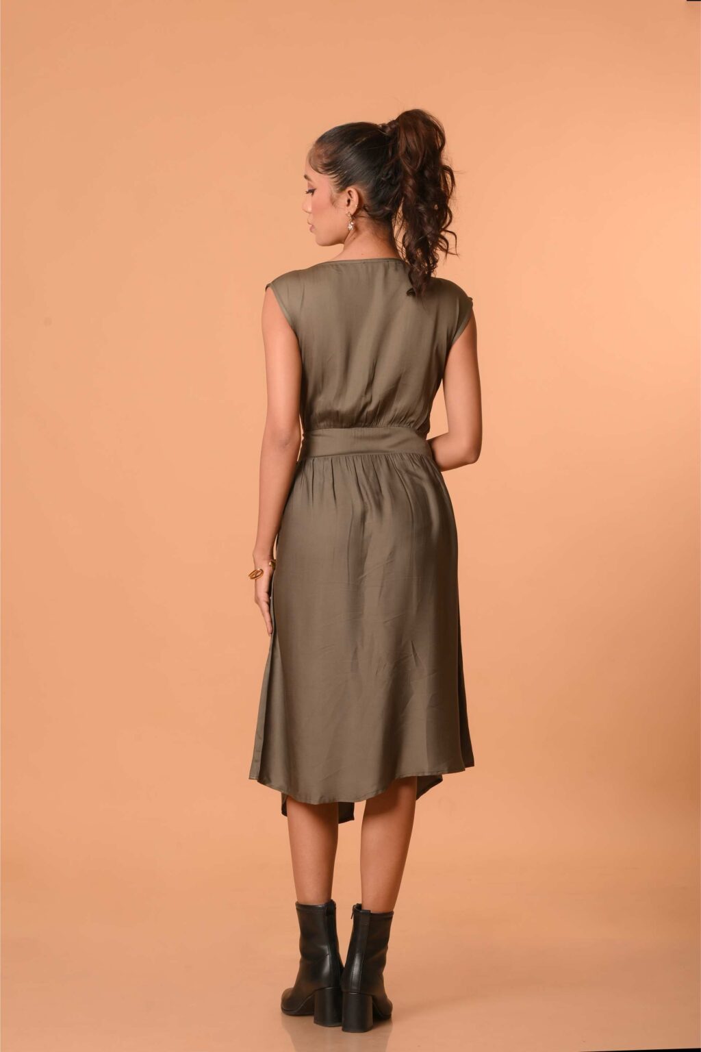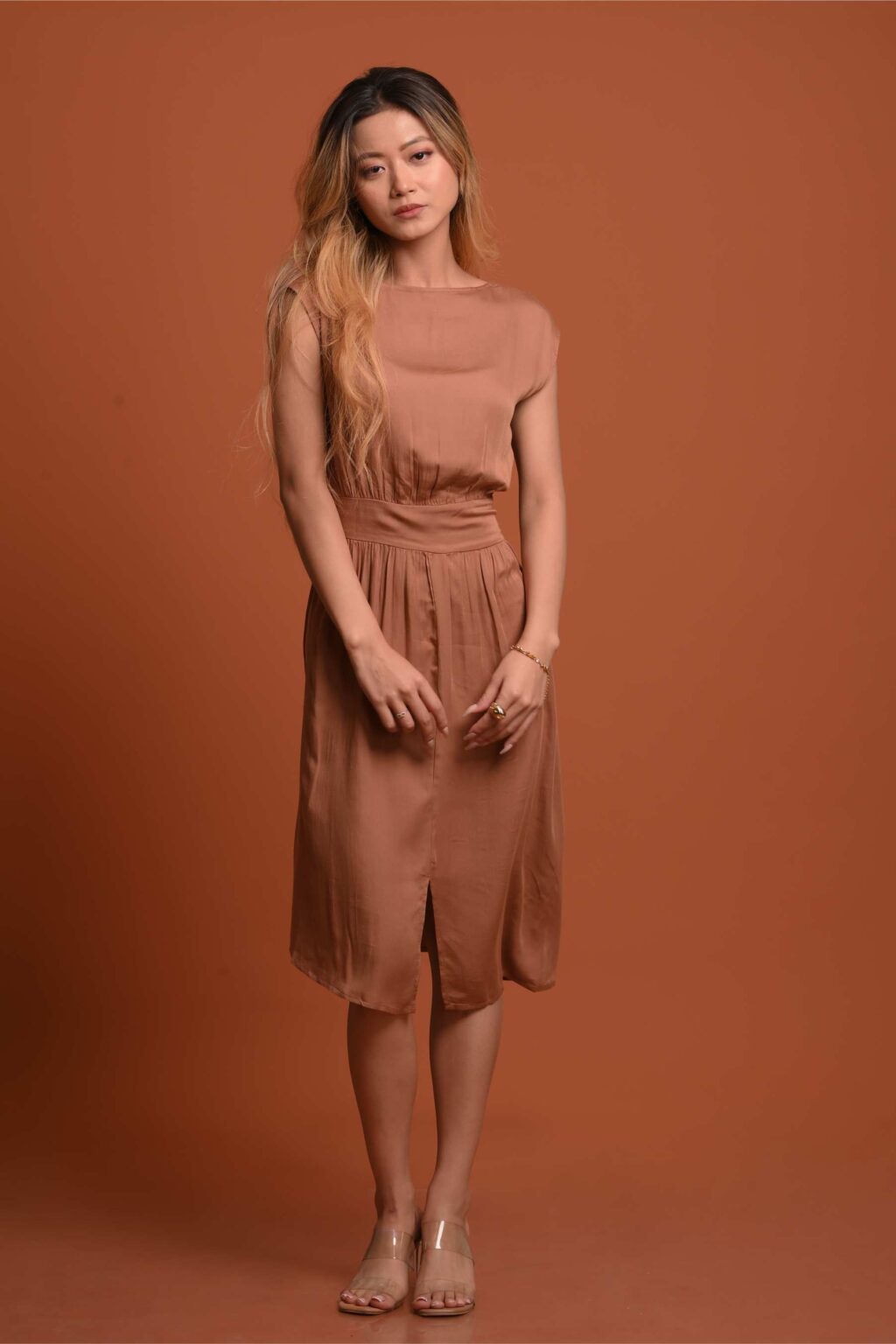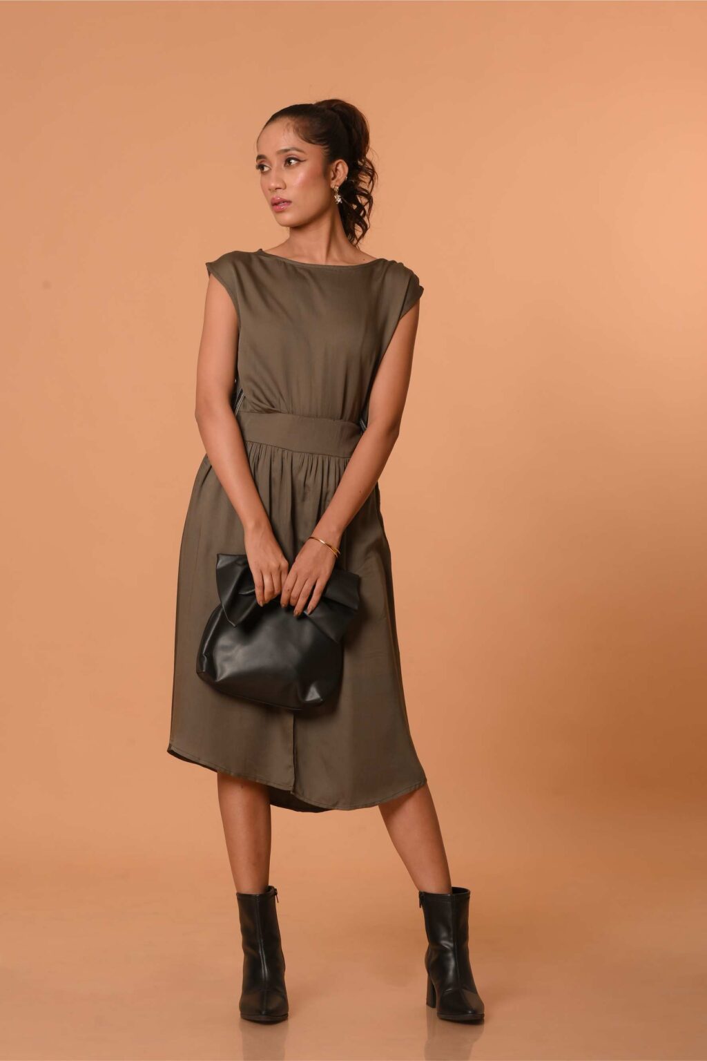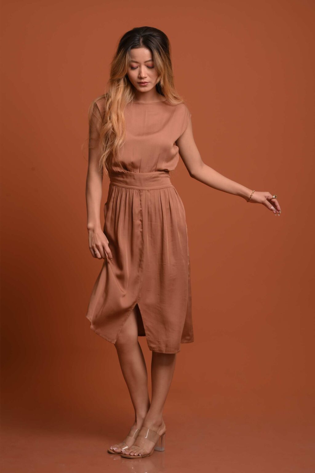 A quiet yet statement-making piece in viscose satin, this midi dress is designed with gathered detailing along the side, creating a soft contour that flatters without clinging. The silhouette sits between ease and structure, elevated enough for evenings yet effortless for everyday wear.