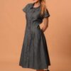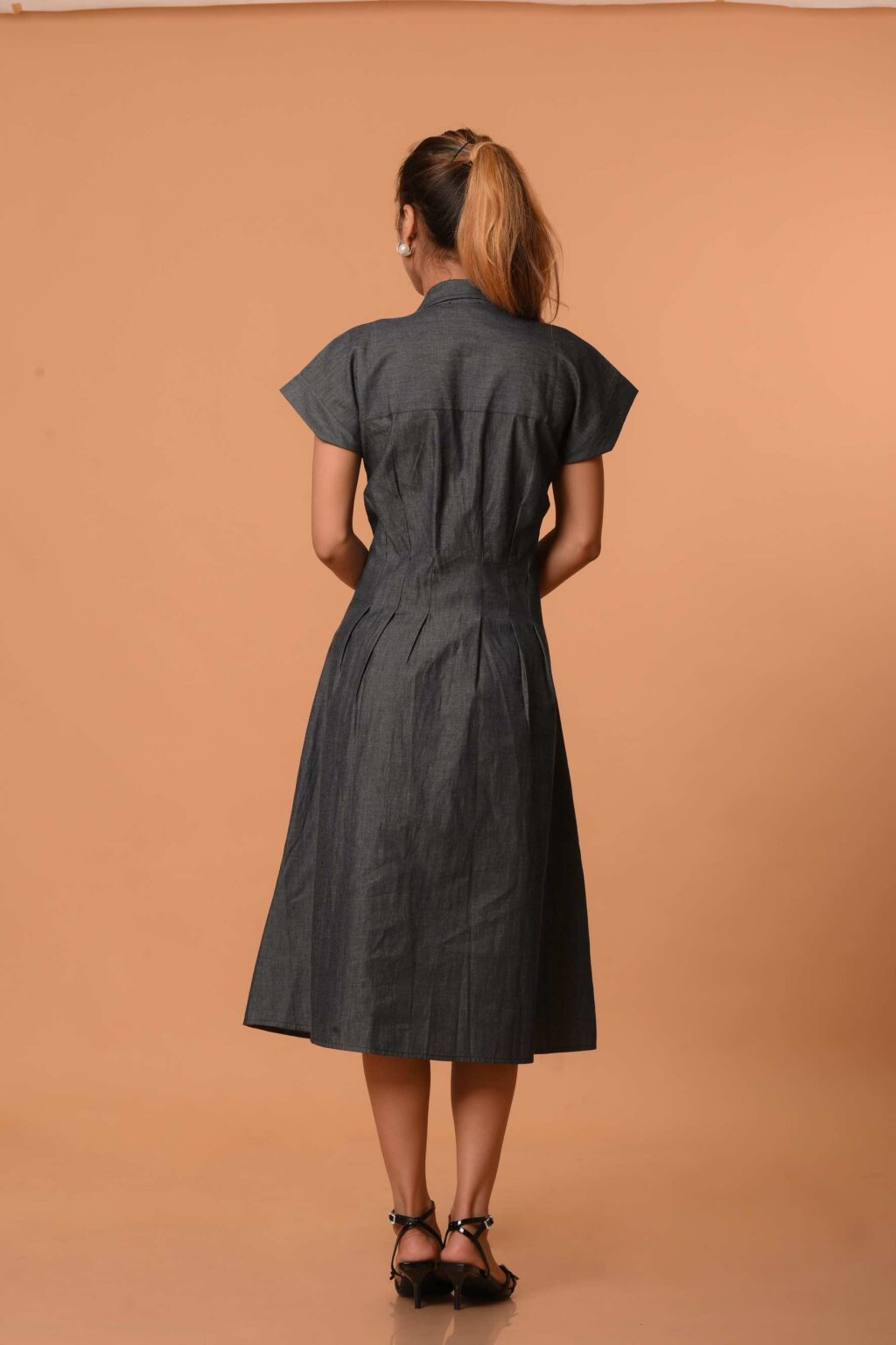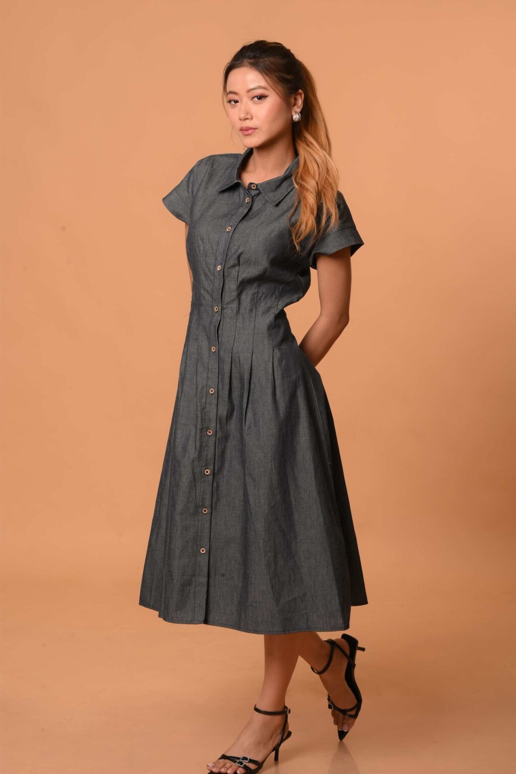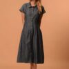 A refined take on everyday denim, this midi dress blends structure with ease. The tailored pin-tucks beneath the bust subtly enhance the natural waistline, creating a flattering, curvy silhouette without compromising comfort. The button-down front adds versatility, making it effortless for day-to-night wear. Finished with short, easy sleeves and a gentle flare, it brings together timeless design and modern minimalism.