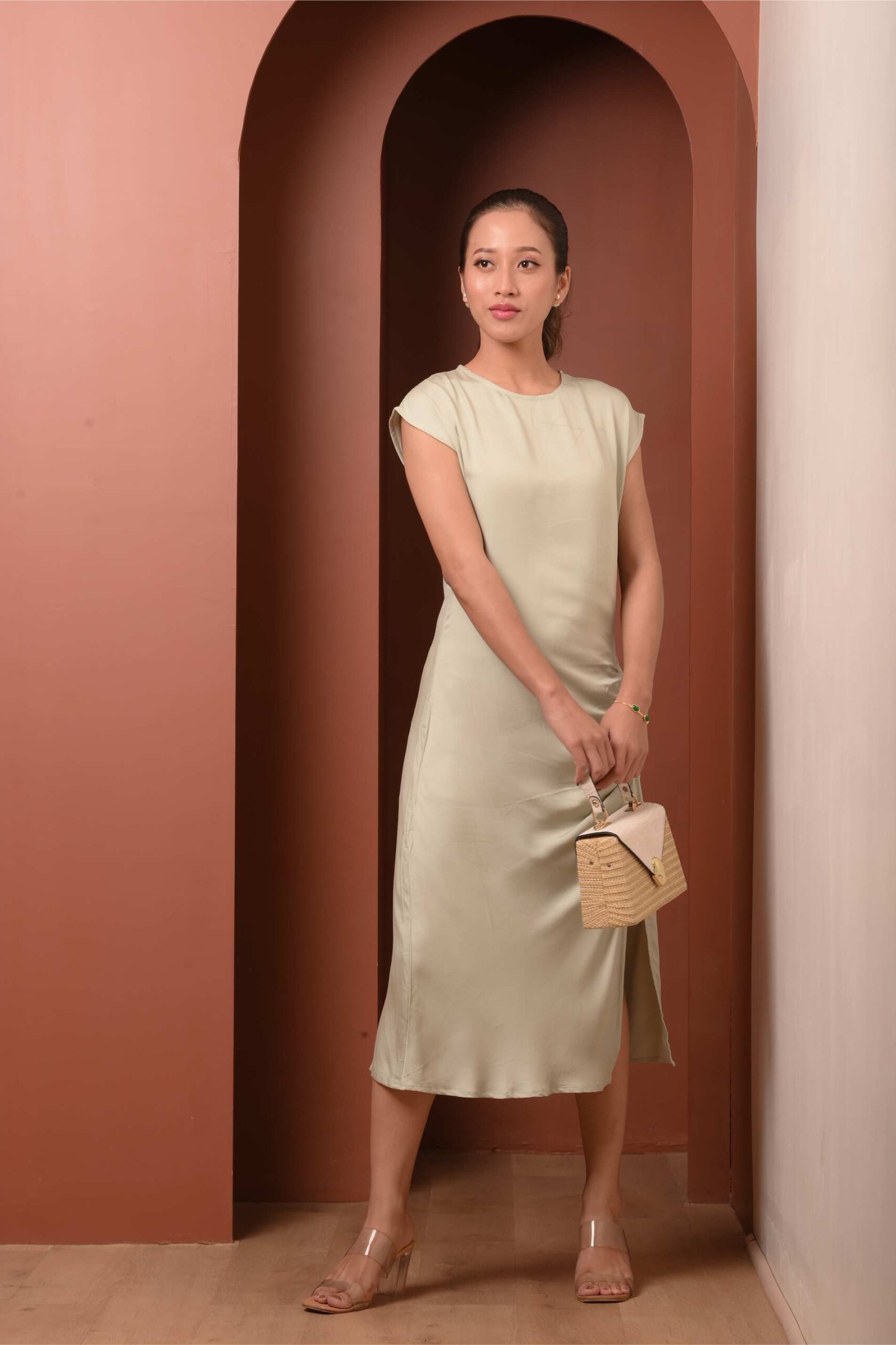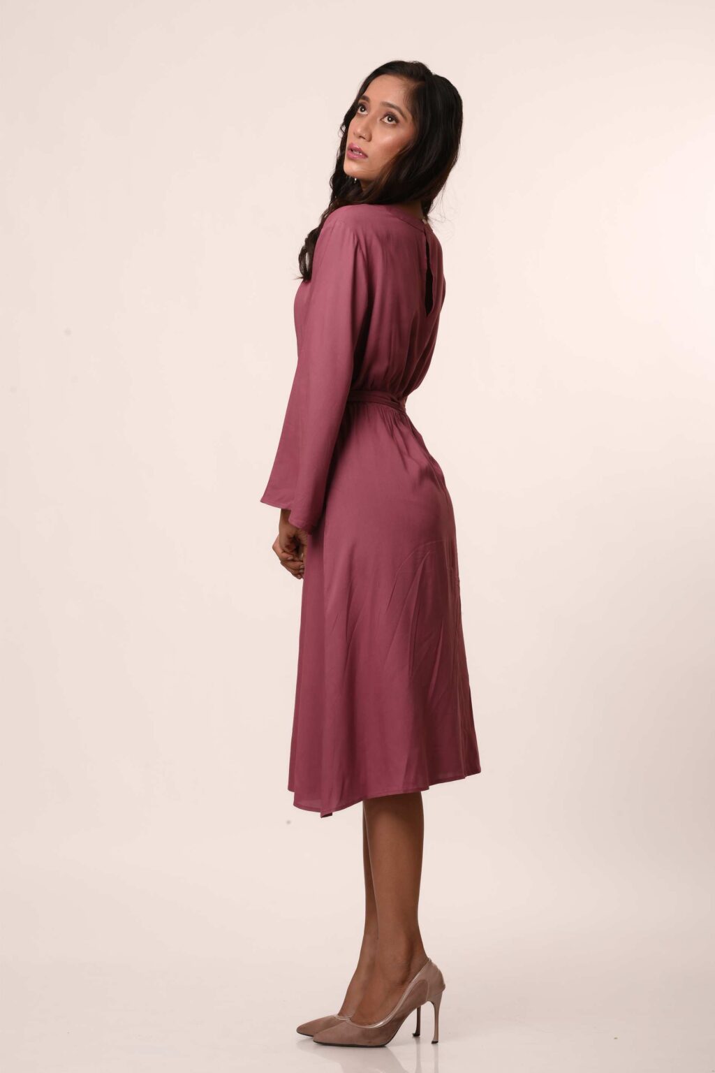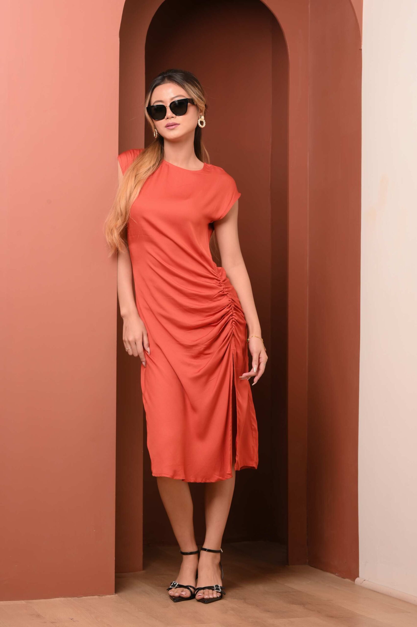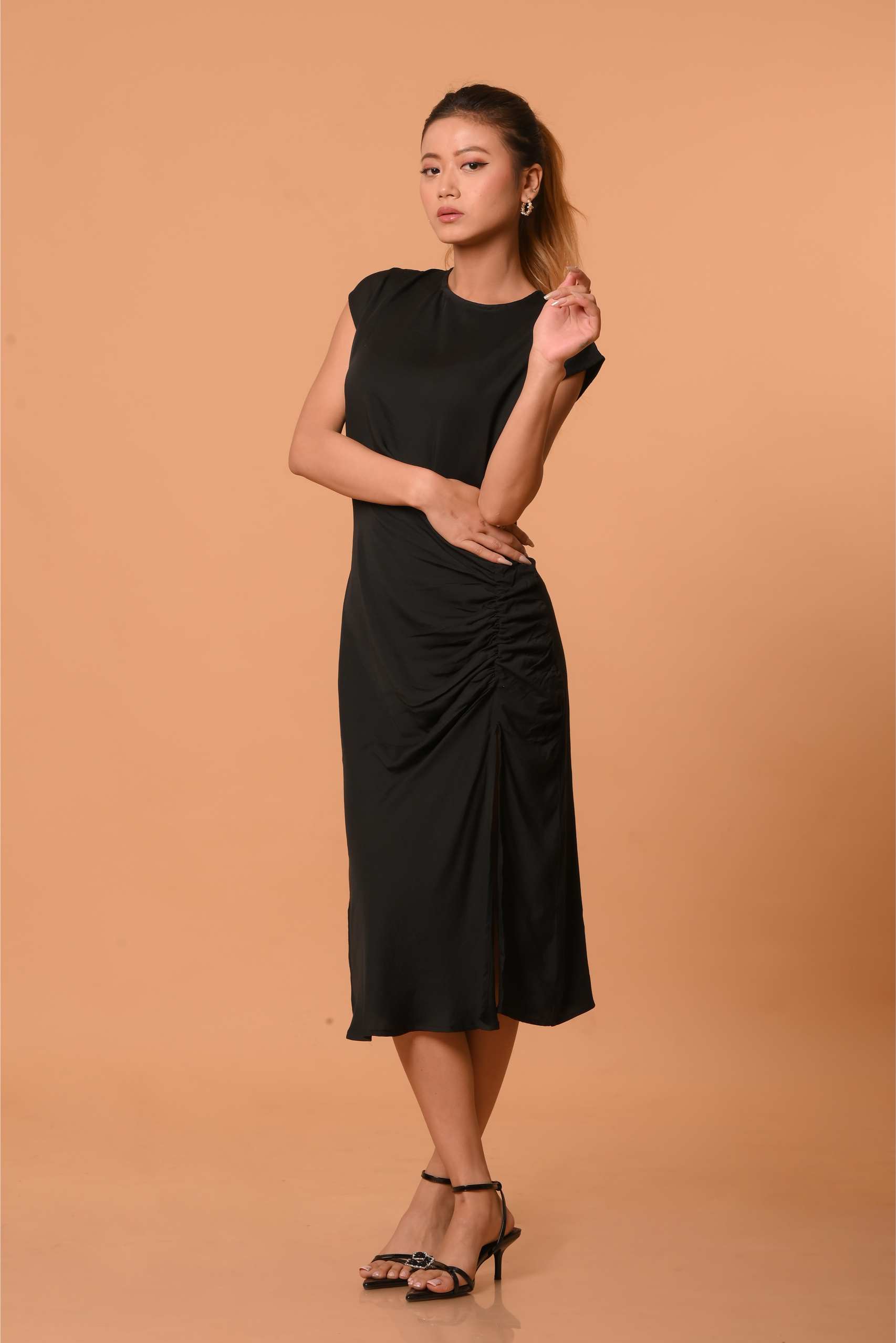 A quiet yet statement-making piece in viscose satin, this midi dress is designed with gathered detailing along the side, creating a soft contour that flatters without clinging. The silhouette sits between ease and structure, elevated enough for evenings yet effortless for everyday wear.