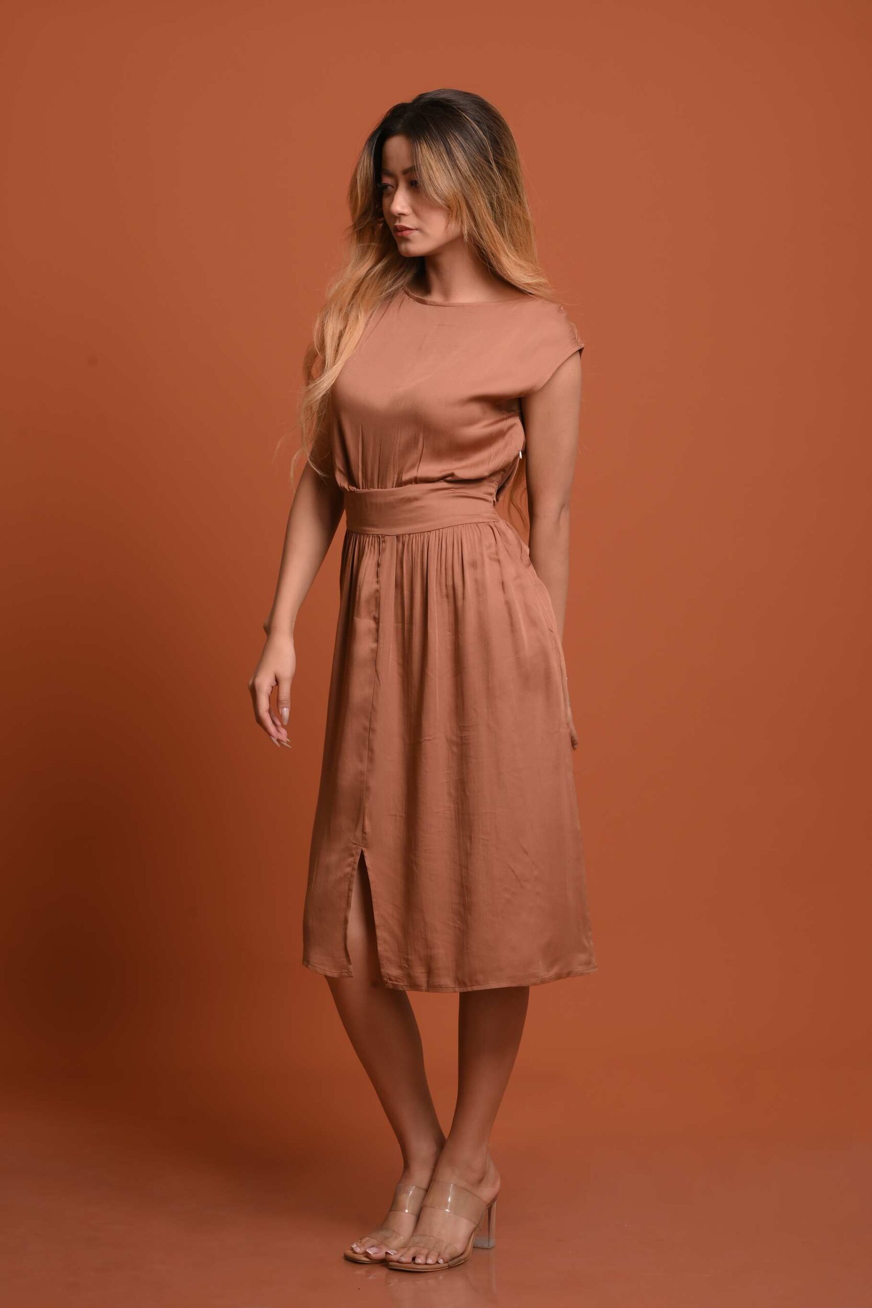 Softly structured and effortlessly feminine, this viscose satin midi dress is designed with a wide, shaped waistband that defines the waist without feeling tight. Gentle gathers fall from the waist, creating natural movement and an easy, elegant drape.