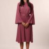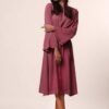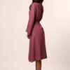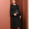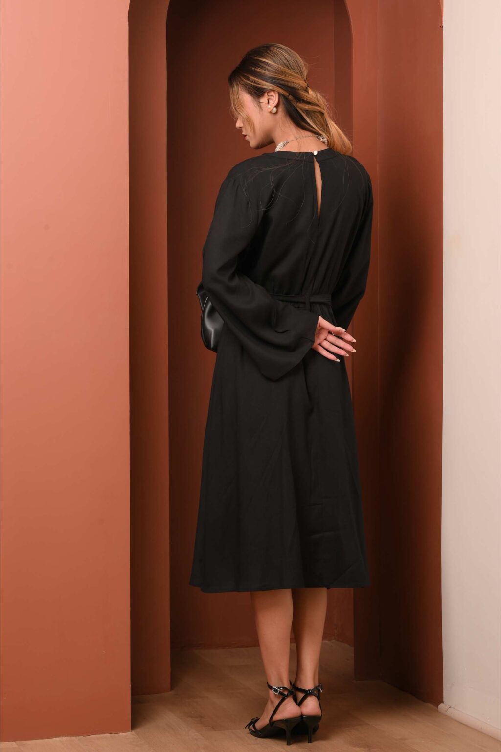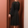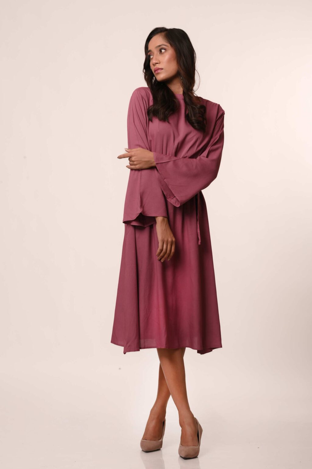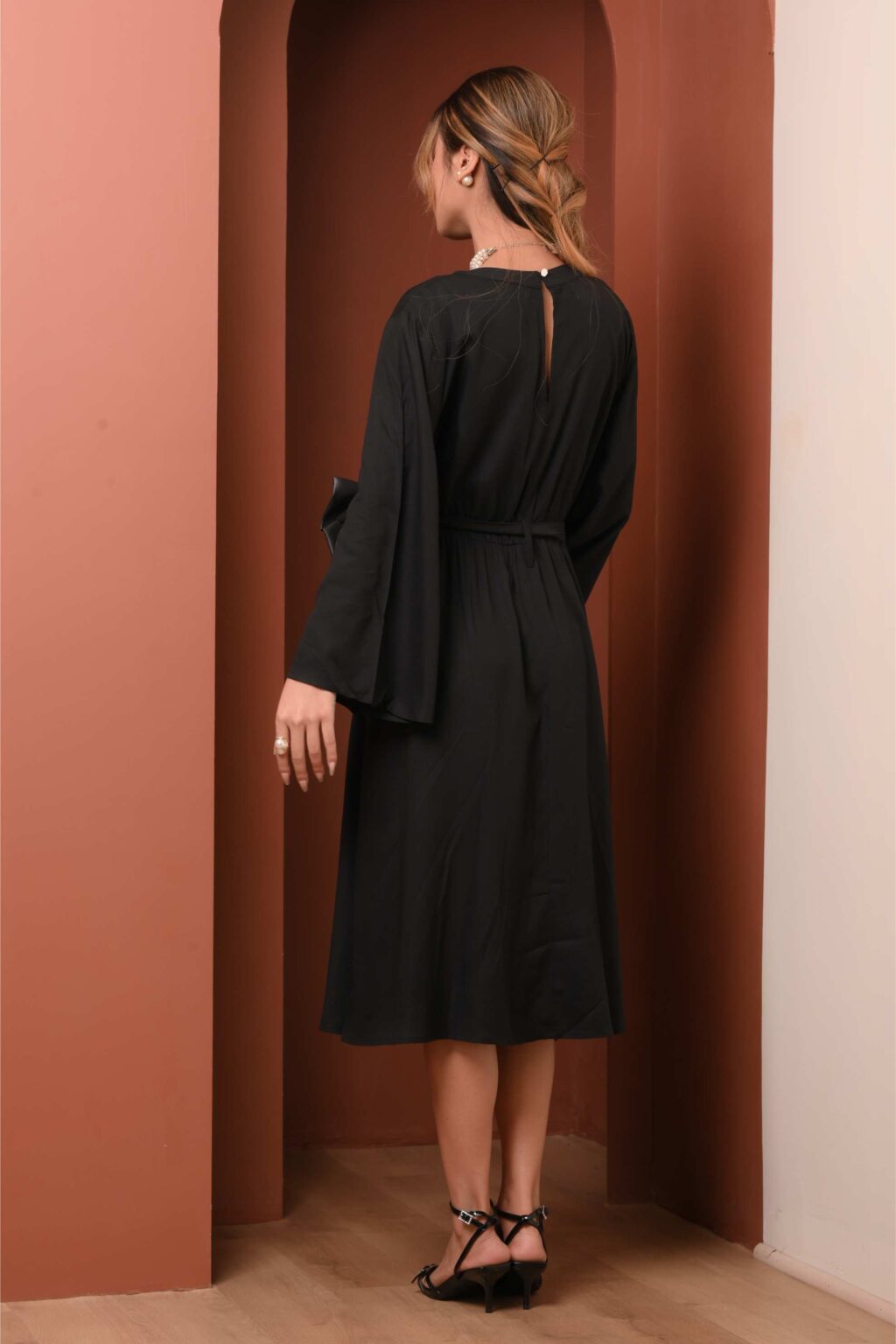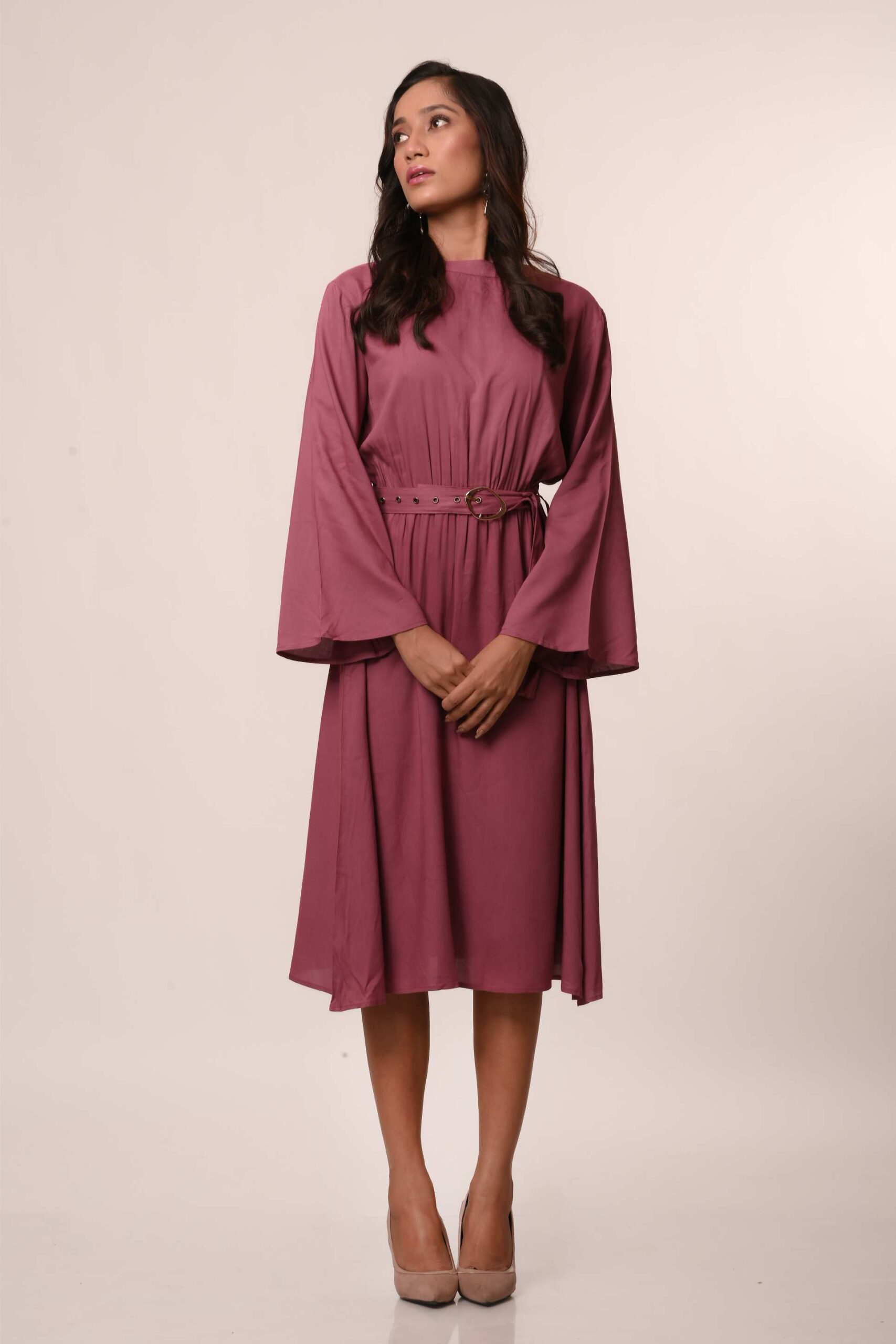 An elevated classic designed with soft structure and fluid ease. This 100% viscose midi dress features gently flared sleeves that create a subtle statement while maintaining a clean, refined silhouette. The waist is finished with a tonal belt featuring a metal buckle, adding definition without overpowering the look.