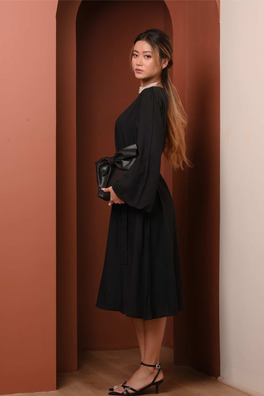 The extended sleeves add a thoughtful balance, offering coverage while maintaining a sleek, modern line. Completed with a refined slit for movement, this dress transitions seamlessly from daytime outings to cocktail moments.