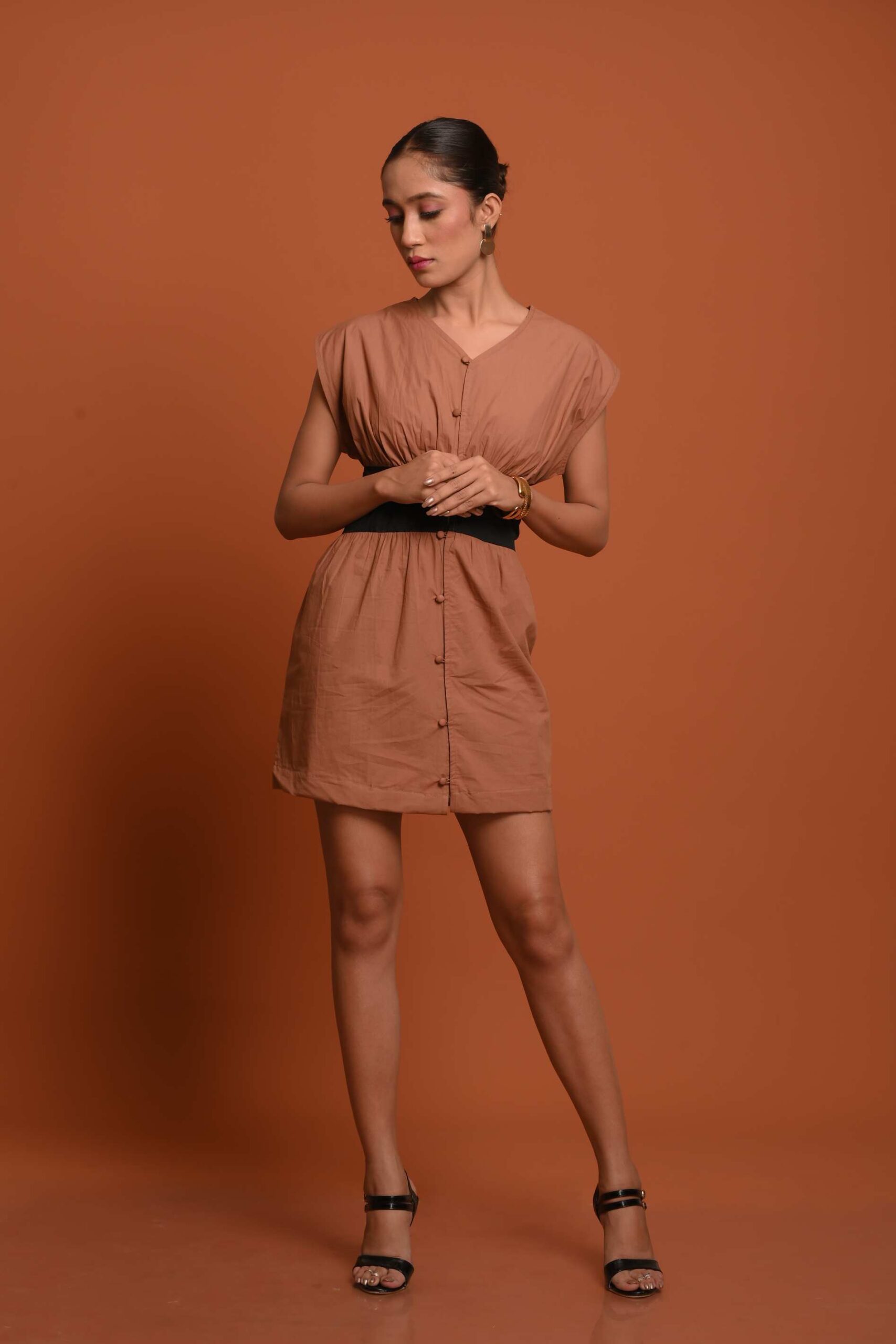 Finished with fabric-covered buttons and a hemline that sits slightly longer than a classic mini, this piece blends everyday comfort with refined structure.