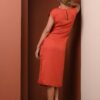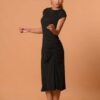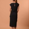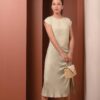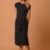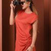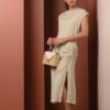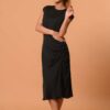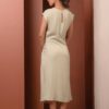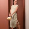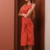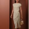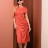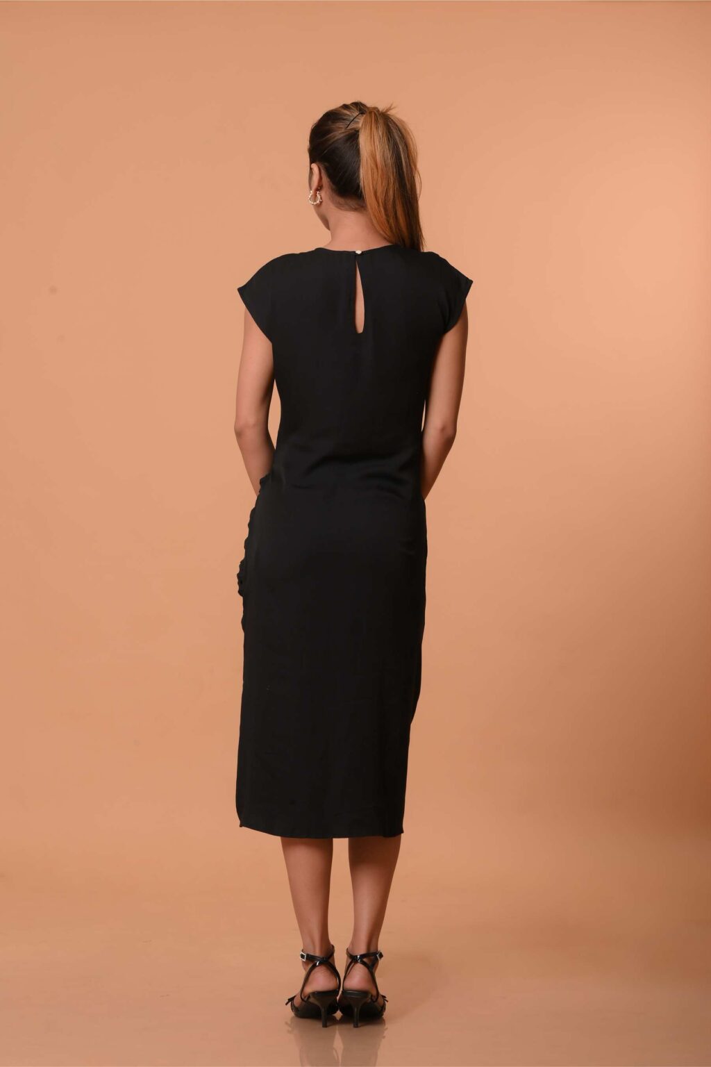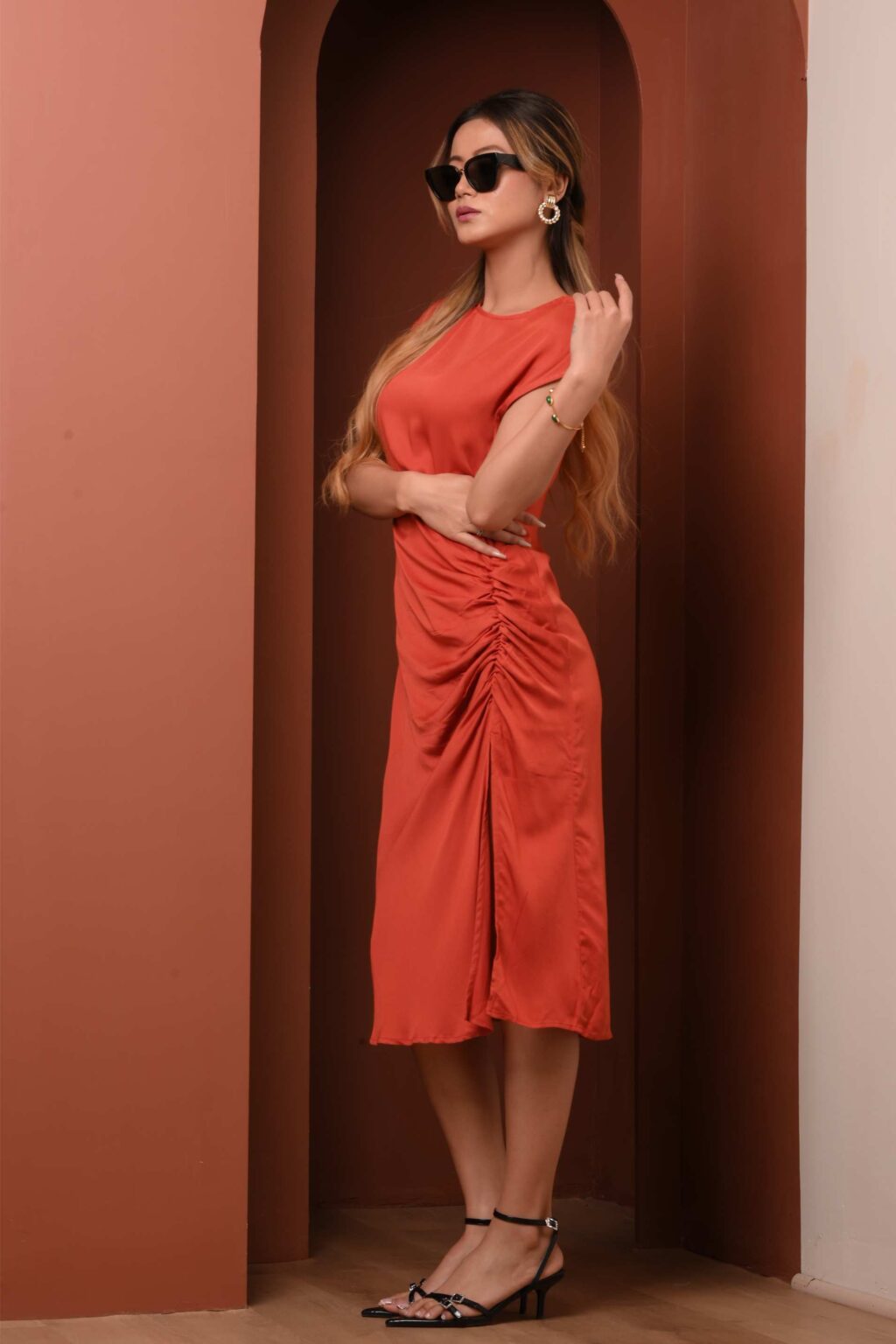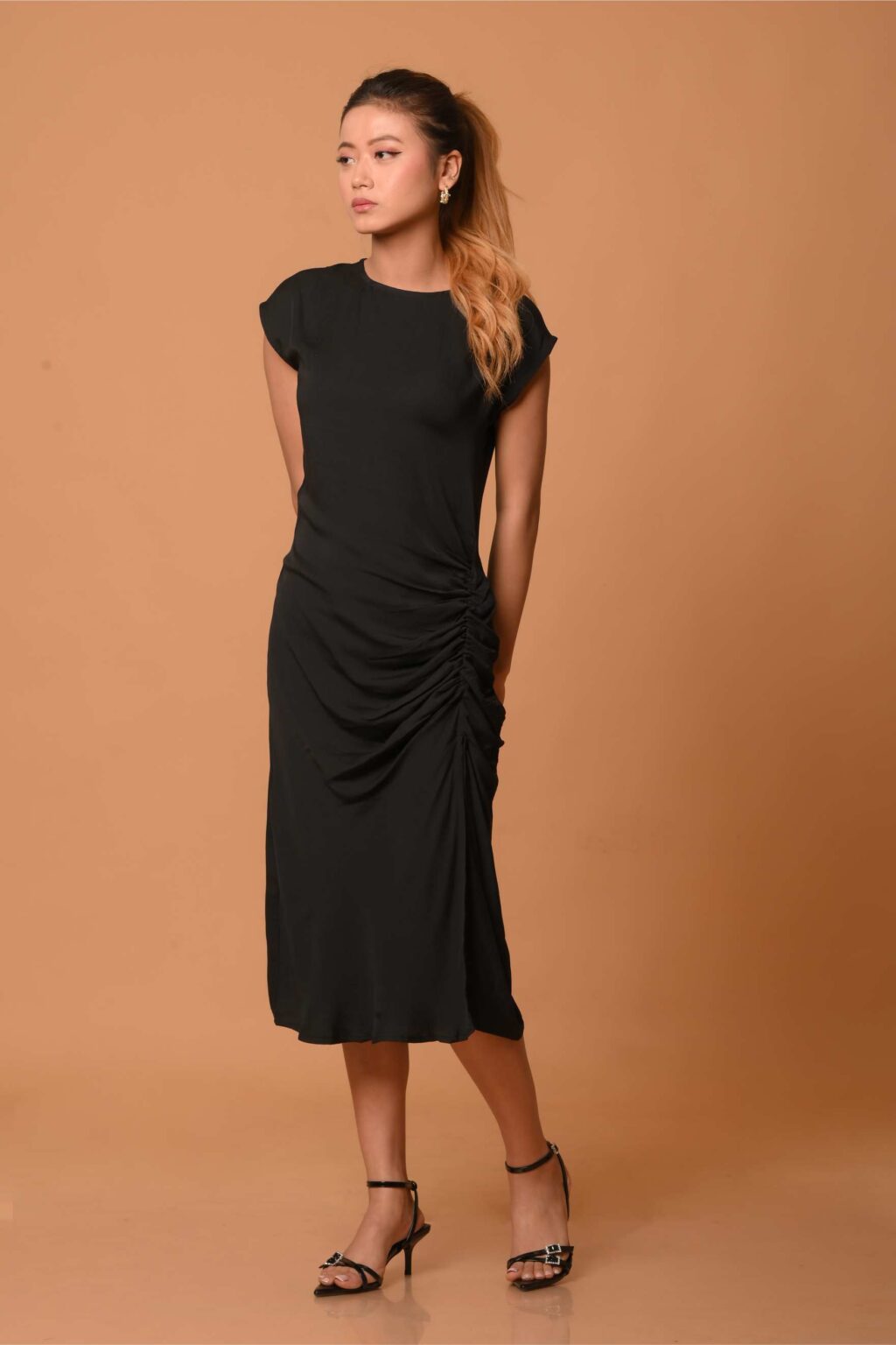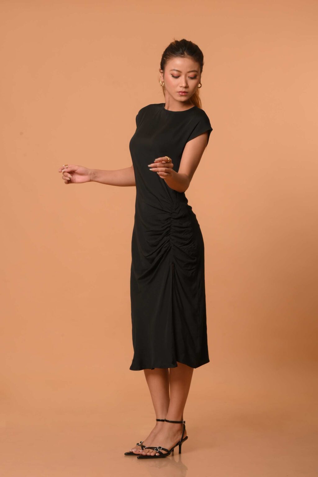 A quiet yet statement-making piece in viscose satin, this midi dress is designed with gathered detailing along the side, creating a soft contour that flatters without clinging. The silhouette sits between ease and structure, elevated enough for evenings yet effortless for everyday wear.