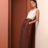 Crafted in fluid viscose, this two-piece set blends sculptural detailing with a modern, asymmetric silhouette. The one-shoulder top features soft center gathers, anchored by a signature metal grain-shaped pin for a refined accent. An elastic panel at the back ensures a secure, comfortable fit while maintaining a clean front shape.
