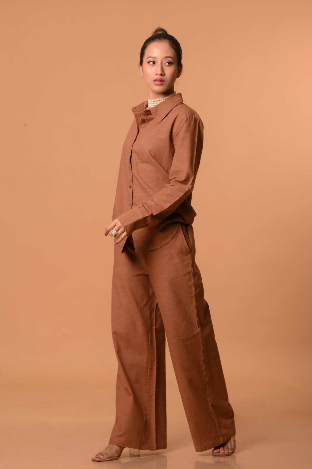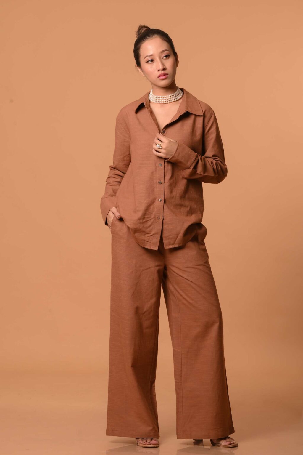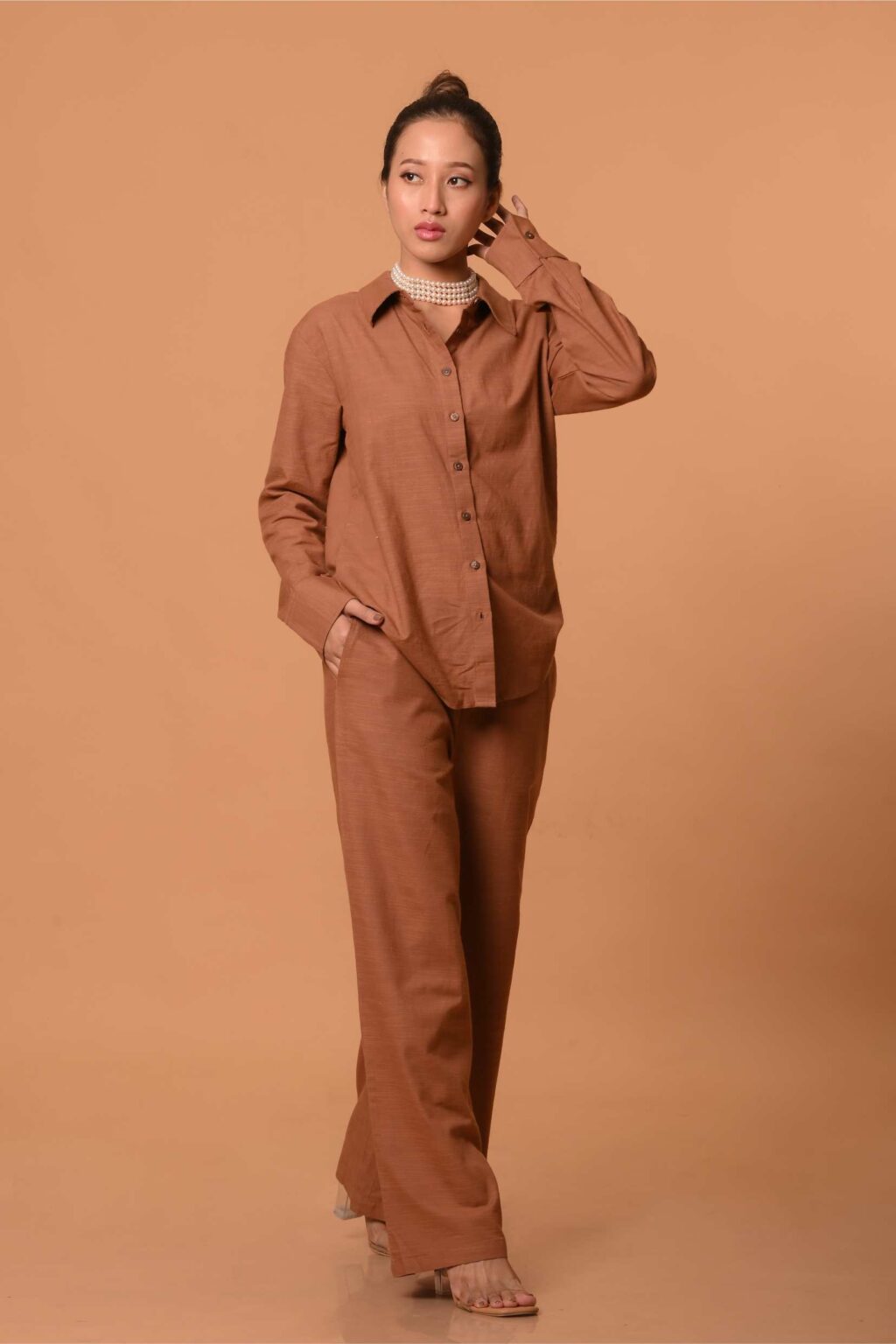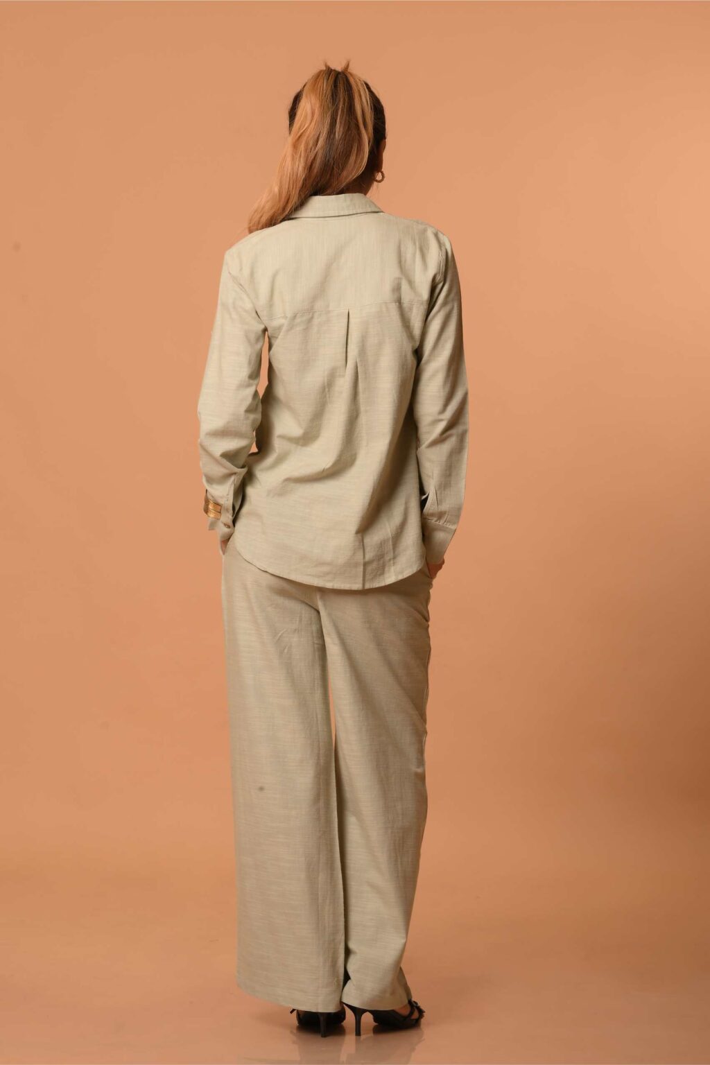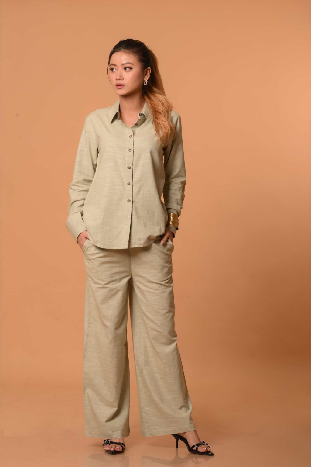 A relaxed yet refined co-ord set crafted from breathable cotton–linen, designed for all-day comfort with a polished, minimal finish. The shirt features natural wooden buttons, adding an earthy, sustainable touch to its clean button-down silhouette. With a soft collar and fluid drape, it transitions effortlessly between casual and elevated looks.