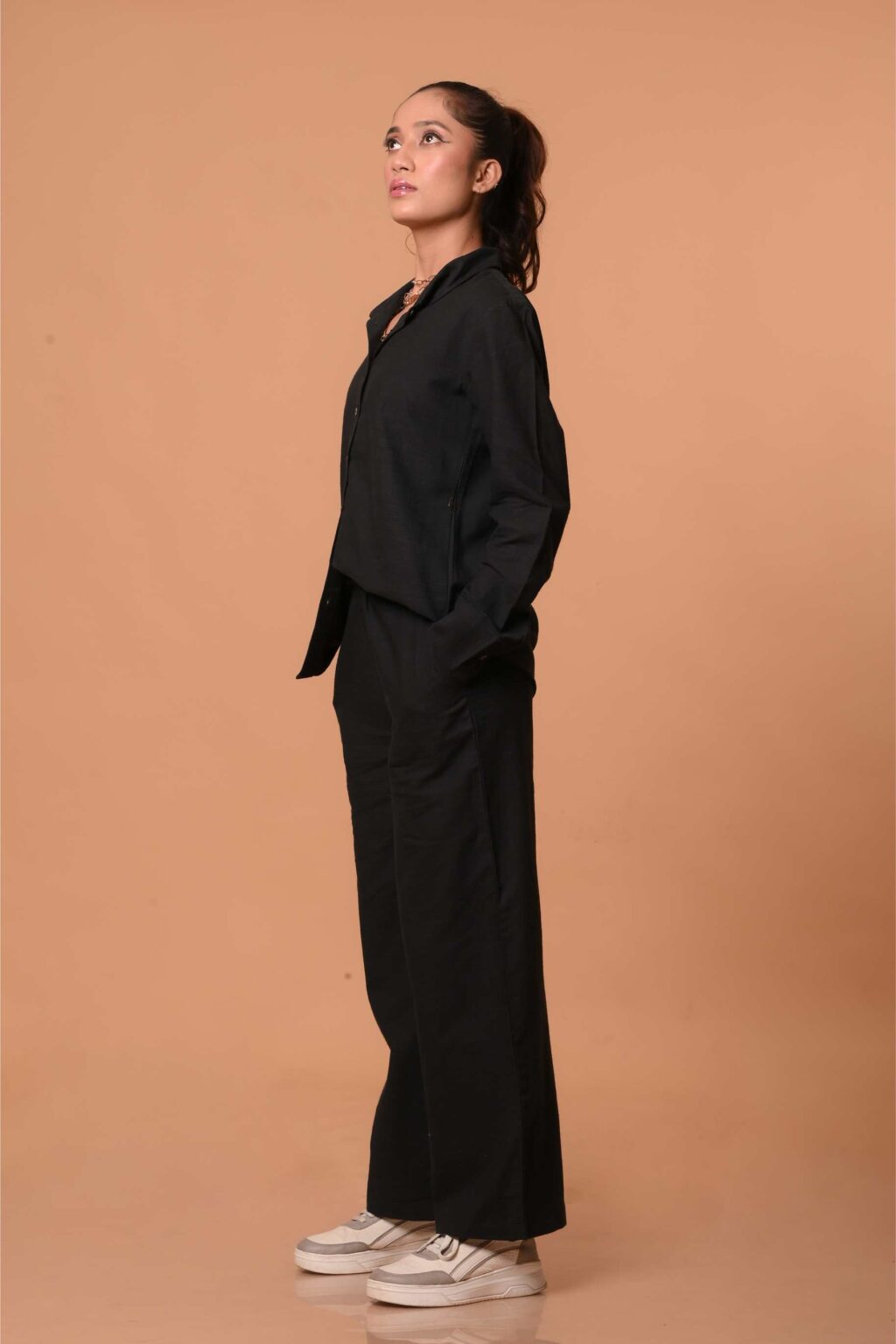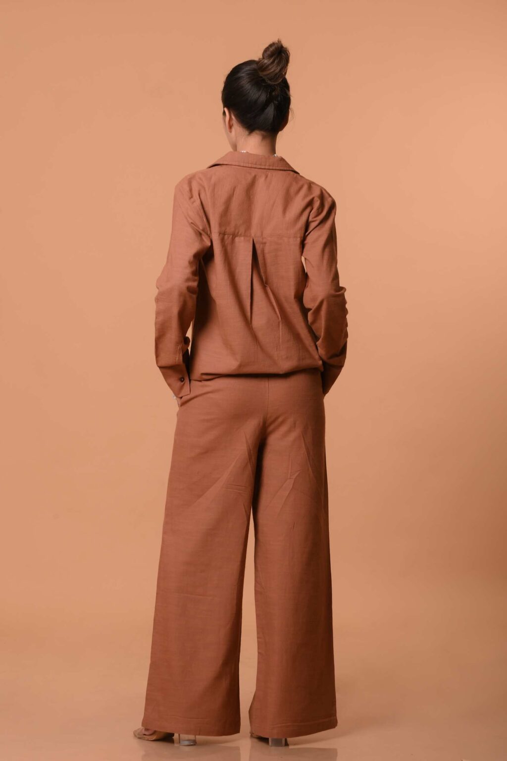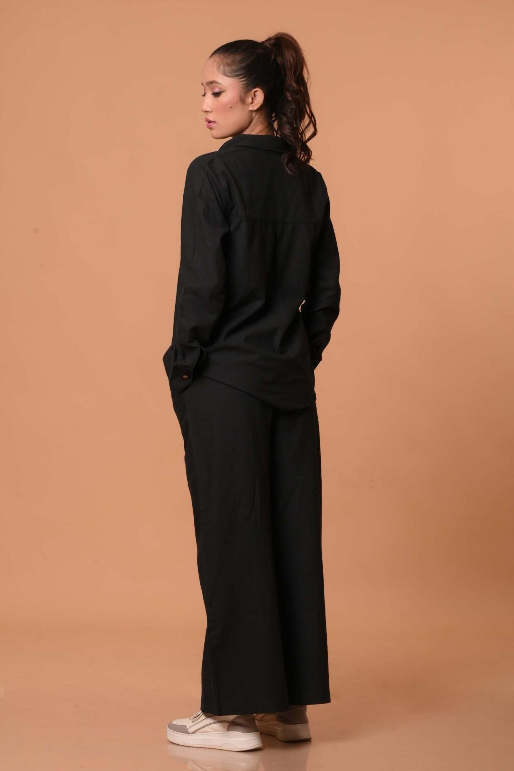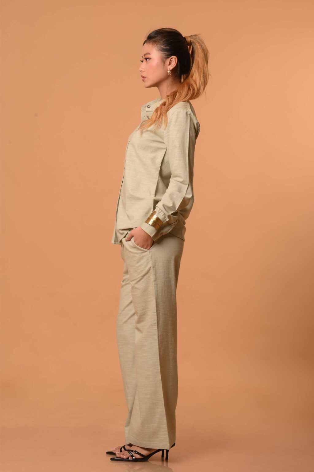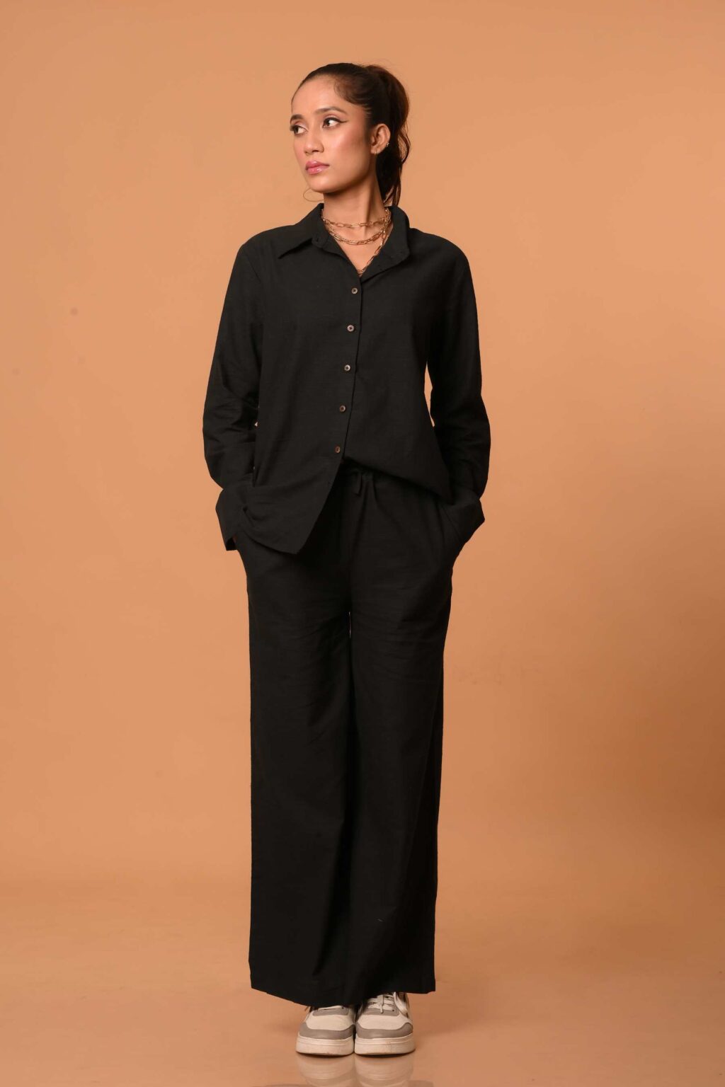 A relaxed yet refined co-ord set crafted from breathable cotton–linen, designed for all-day comfort with a polished, minimal finish. The shirt features natural wooden buttons, adding an earthy, sustainable touch to its clean button-down silhouette. With a soft collar and fluid drape, it transitions effortlessly between casual and elevated looks.